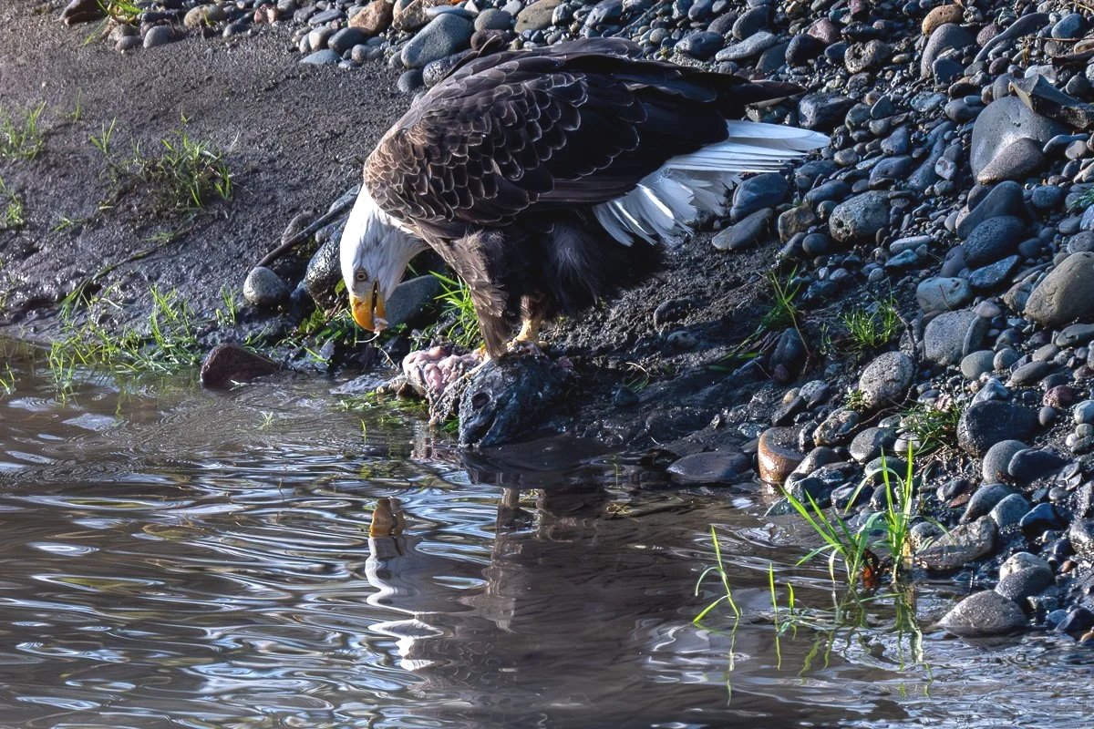 Here, the bald eagle is eating scraps from a meat processing center because they could not find a reliable source and amount of salmon in the river.